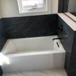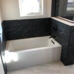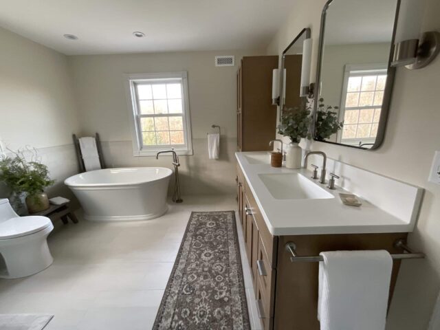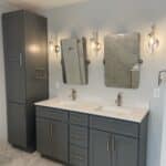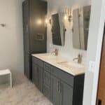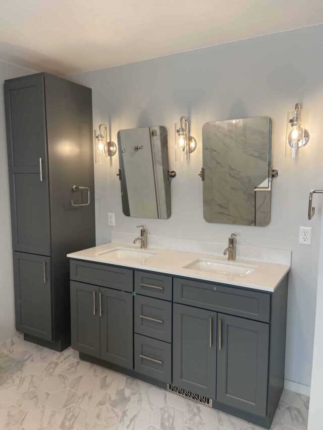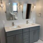 Transform your bathroom into a sanctuary of style with this elegant double vanity design. Featuring sleek gray cabinets, luxurious marble countertops, and modern lighting. This set up offers ample storage and timeless sophistication. Perfect for enhancing your daily routine with a touch of luxury.
