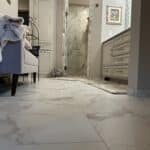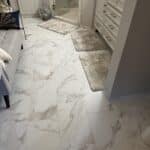 A black and white bathroom can create a stunning timeless aesthetic. IF you want both elegant and clean feeling, go black and white. This space was created using a combination of Daltiles oversized white subway and an oversized hexagon in color Black Poll and a smaller version from the mosaics matte black.