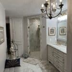 To start, the vanity and linen are a custom build. We worked with our local cabinet maker to match the mirror and cabinets perfectly. The top is a Livingstone Solid Surface Color called Sea Pearl. The faucets are Kohlers Tempered Single Handle in a matte black finish. The lights above the vanity were a customer…