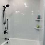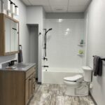 These soft grays add a romantic look to this space. The tile is Daltile brand Articulo in Column Gray on the walls and floor in a 12×24. The shower floor is a Vintage Hex in Artifacts Gray mosaic pattern. The shower trim is Kohler’s Forte in brushed nickel. The shelves in the shower are a…